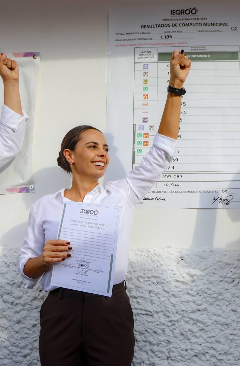 Cancún, Q. R., a 10 de junio de 2024.- Con un total inédito en la historia de Cancún de 268 mil 283 votos a favor, la candidata de Morena, PT y PVEM, Ana Paty Peralta, recibió por parte del Instituto Electoral de Quintana Roo (IEQROO), su constancia de mayoría y validez que la acredita como presidenta municipal electa de Benito Juárez.