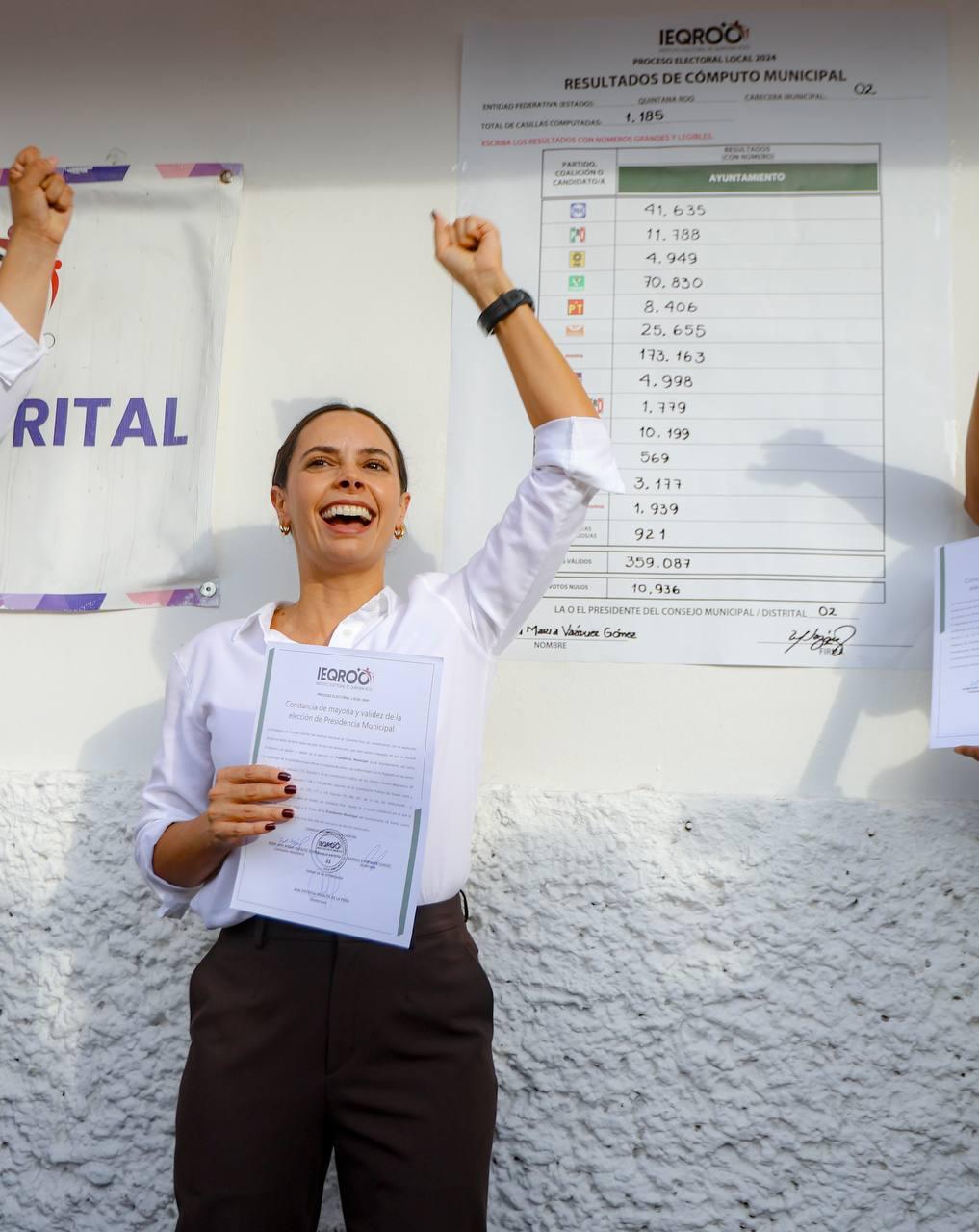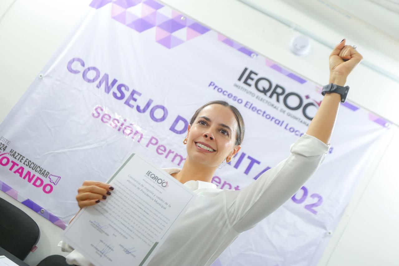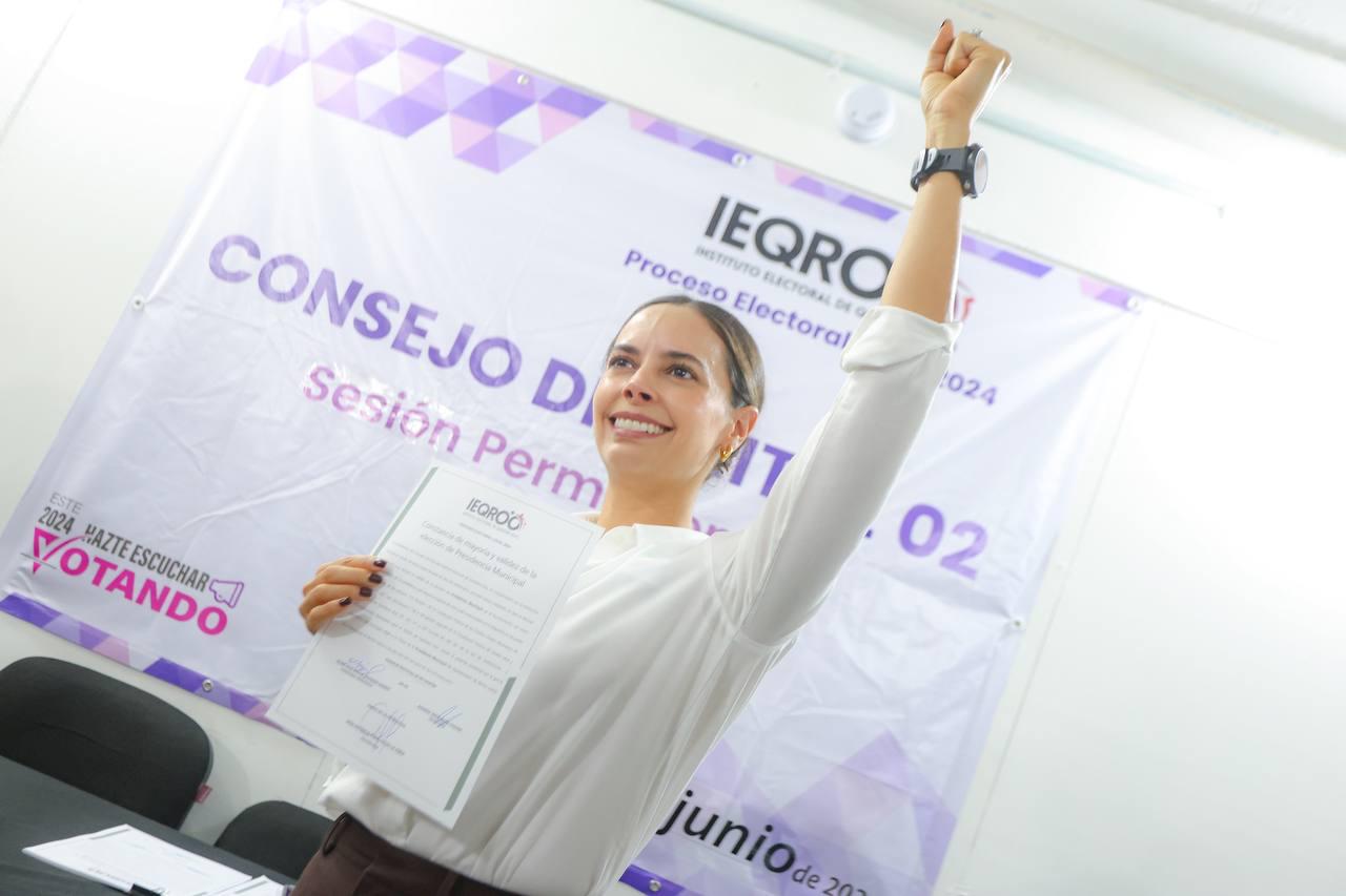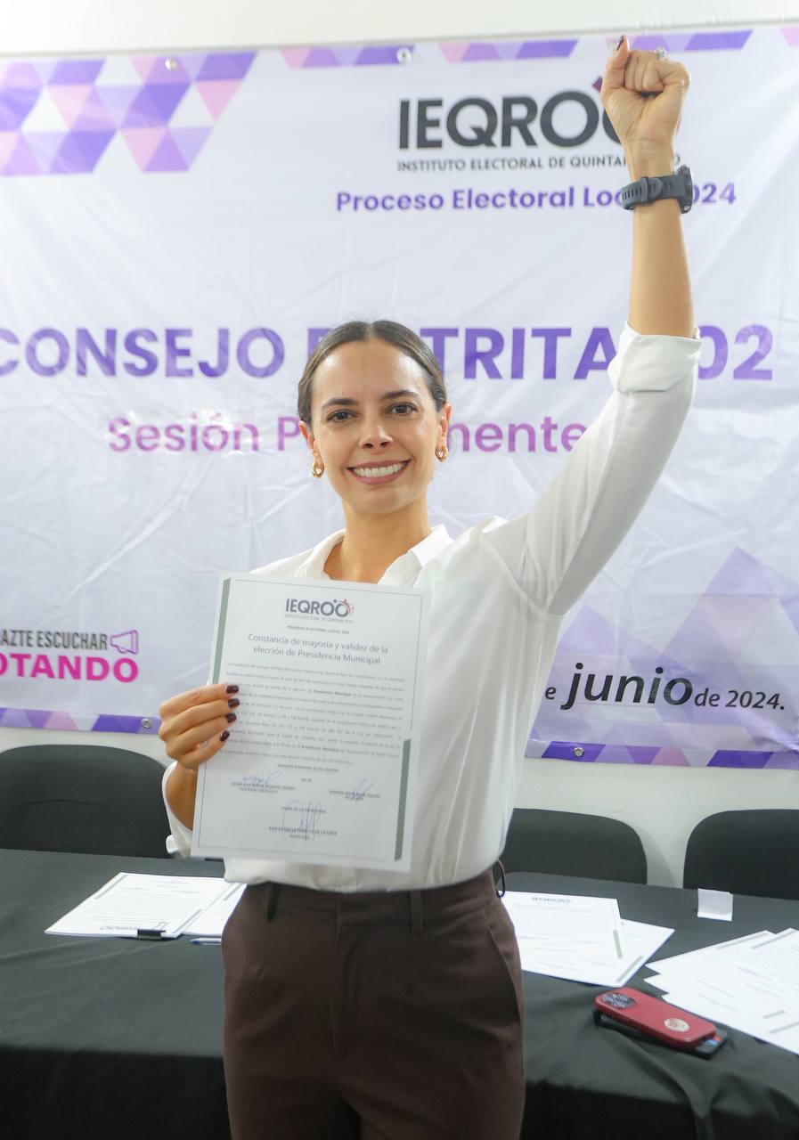 Cancún, Q. R., a 10 de junio de 2024.- Con un total inédito en la historia de Cancún de 268 mil 283 votos a favor, la candidata de Morena, PT y PVEM, Ana Paty Peralta, recibió por parte del Instituto Electoral de Quintana Roo (IEQROO), su constancia de mayoría y validez que la acredita como presidenta municipal electa de Benito Juárez.